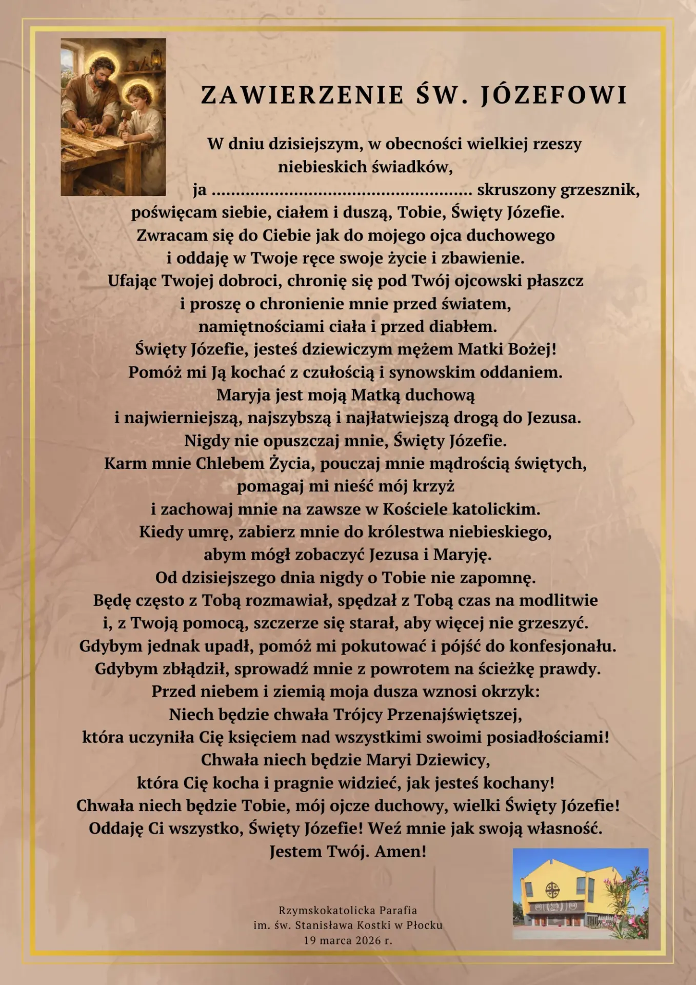 - Początek w sobotę 14.02.2026 r., Msza Święta na rozpoczęcie o godz. 20:00, kończymy uroczystym Aktem Zawierzenia w uroczystość św. Józefa w czwartek 19.03.2026 r. Mszą Świętą o godz. 20:00.